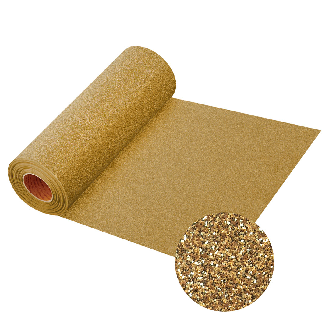 Glittrig textilvinyl med kraftfull struktur och intensiv glittereffekt. Ytan är tydligt kornig, nästan som fint sandpapper, vilket ger ett uttryck som både syns och känns. Här handlar det inte om diskret skimmer – utan om glitter som gnistrar ordentligt och fångar ljuset från alla håll.