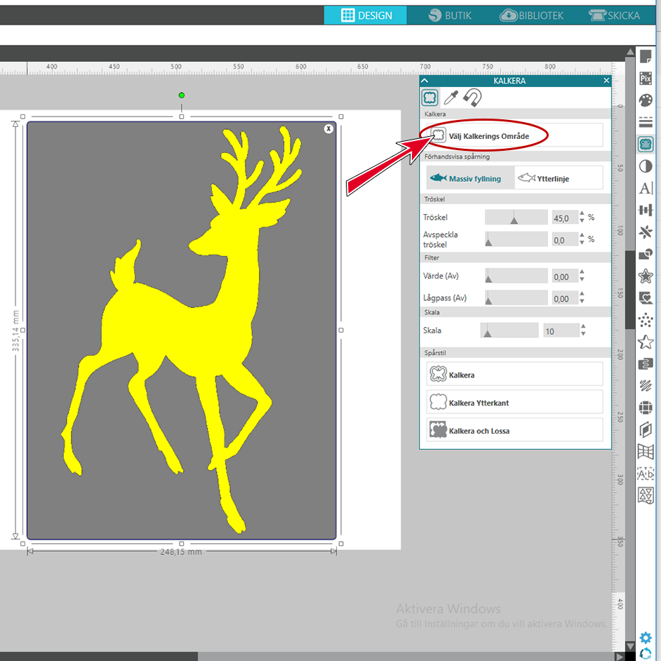 Jag börjar med en svartvit jpg-fil med en hjort…ren…älg…(?) Ja, antagligen inte älg i alla fall och troligtvis ingen ren… Vi säger hjort! Klicka på “Välj kalkeringsområde” och dra en ruta över hjorten som ska kalkeras. Nu blev hela hjorten gul och allt som är gult, kommer att få en skärlinje runt konturerna.